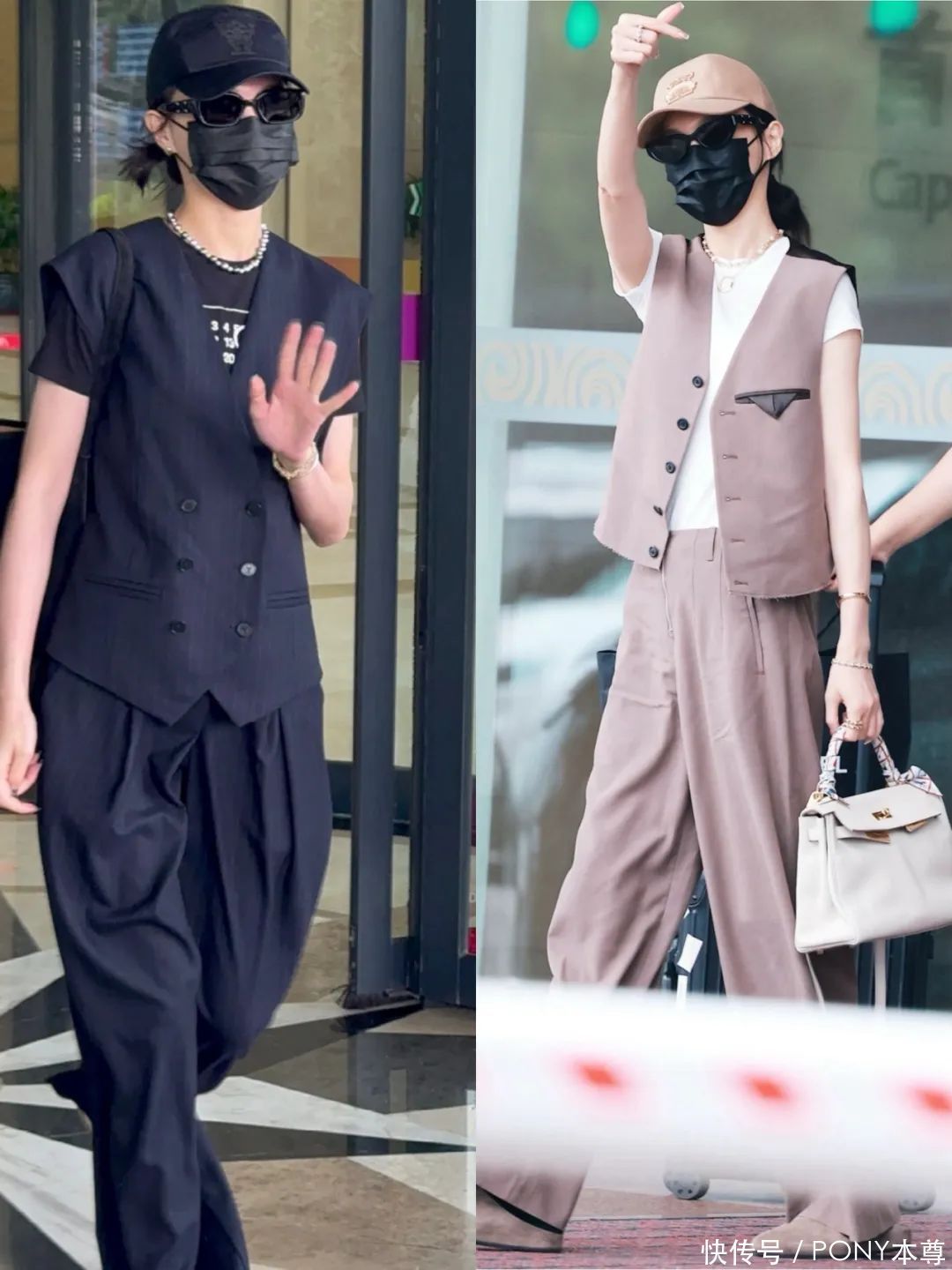 西装马甲背心,聘任基础玄色概况藕粉色,内搭淡色系T恤概况白色T恤,通过搭配颈链和棒球帽,气质优雅。